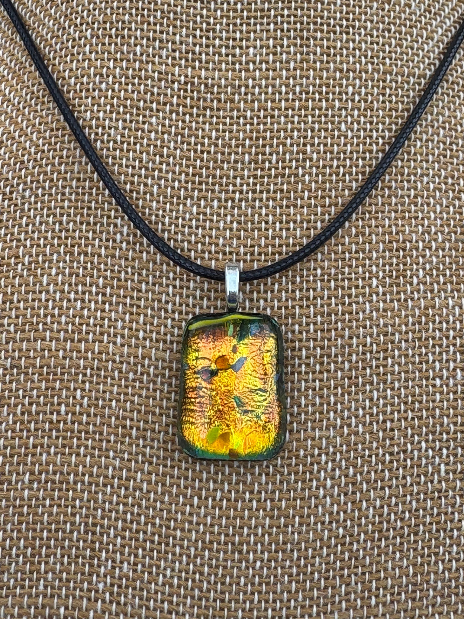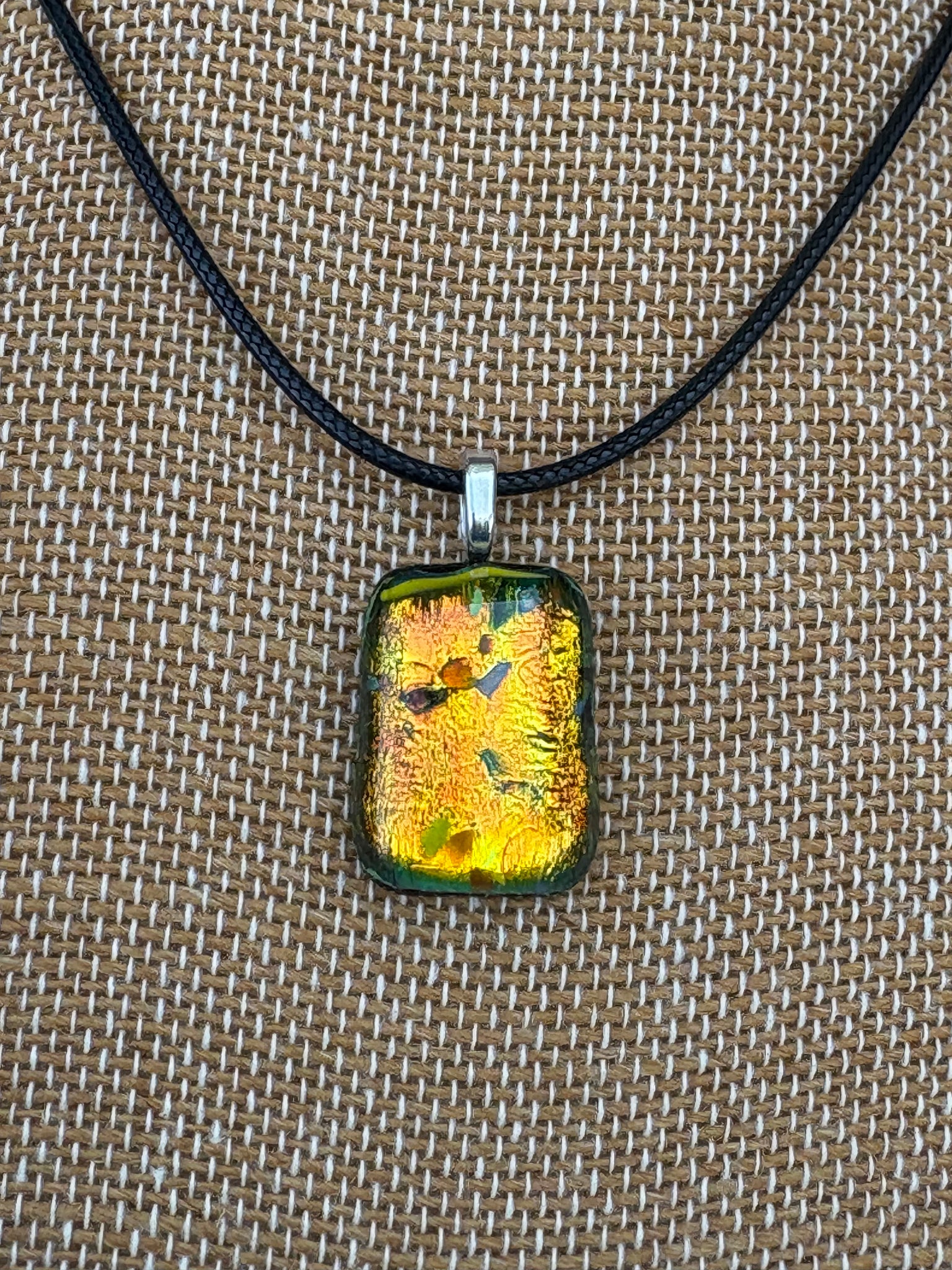 Another good example of the power of dichroic glass to reflect different colors and at different angles. Gold orange one way and green hues from the side.