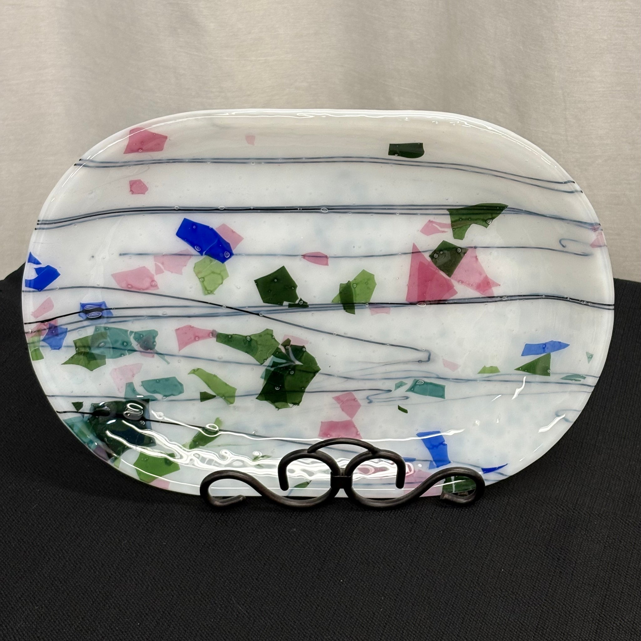 Is it time to add some beauty to your serving dishes? It's glass so it's easy to wash and use for all of the parties and family functions. This is a great size for cookies or appetizers This gorgeous fresh spring look is made with fracture streamer glass for a unique look. Look for the matching wavy platter and small wavy 5 inch dish.